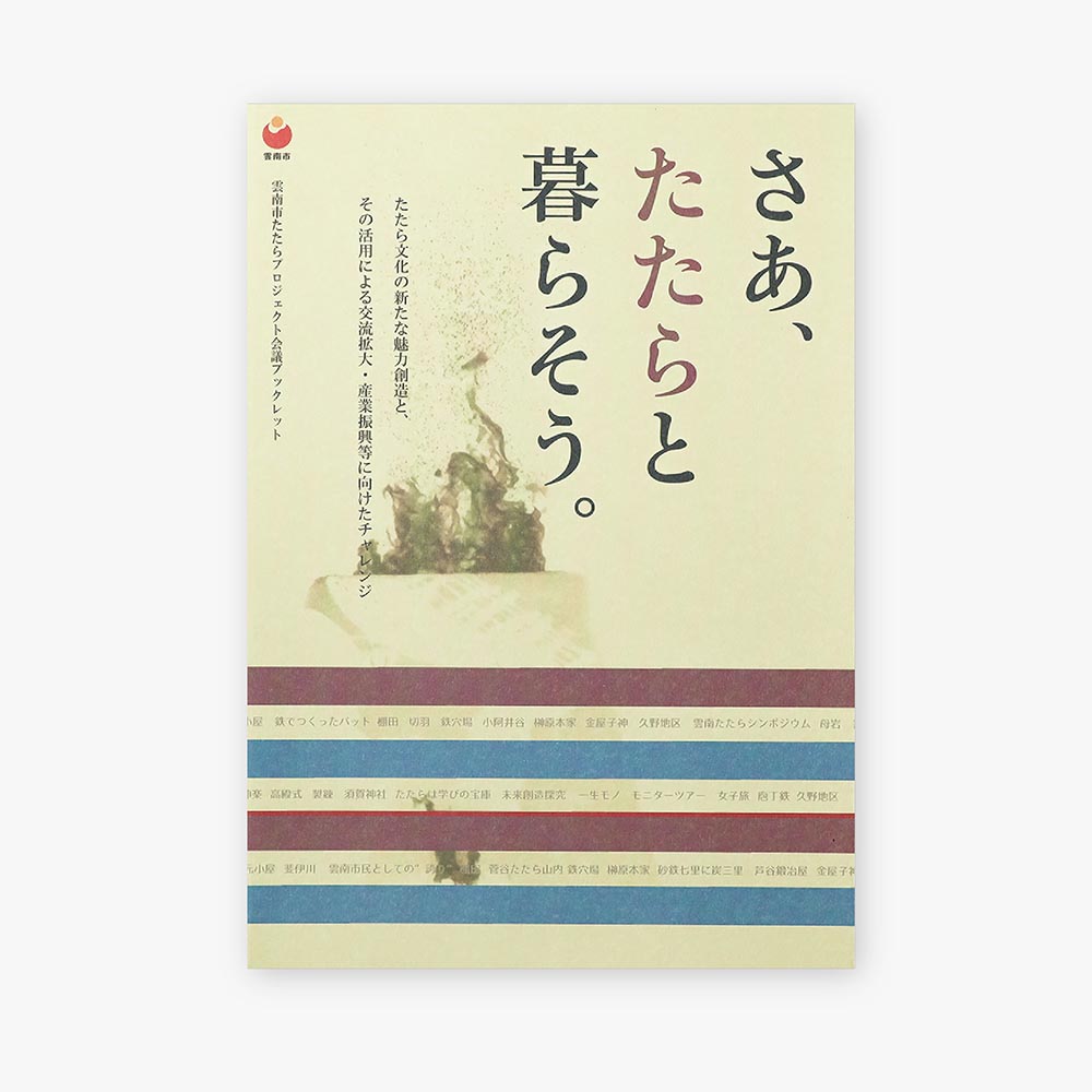 ブックレット さあ、たたらと暮らそう。 島根県雲南市が開催した「雲南市たたらシンポジウム」の内容をまとめたブックレット。たたら文化の情報と知見を、歴史、地域づくり、地元の高等学校での学び、旅行、エンジニア研修など、さまざまな角度から紹介。たたら文化の価値を再認識し、それら文化の伝承と活用を考えることができるように編集しました。 クライアント:雲南市たたらプロジェクト会議 業務内容:編集協力 ブックレット 自治体の情報発信