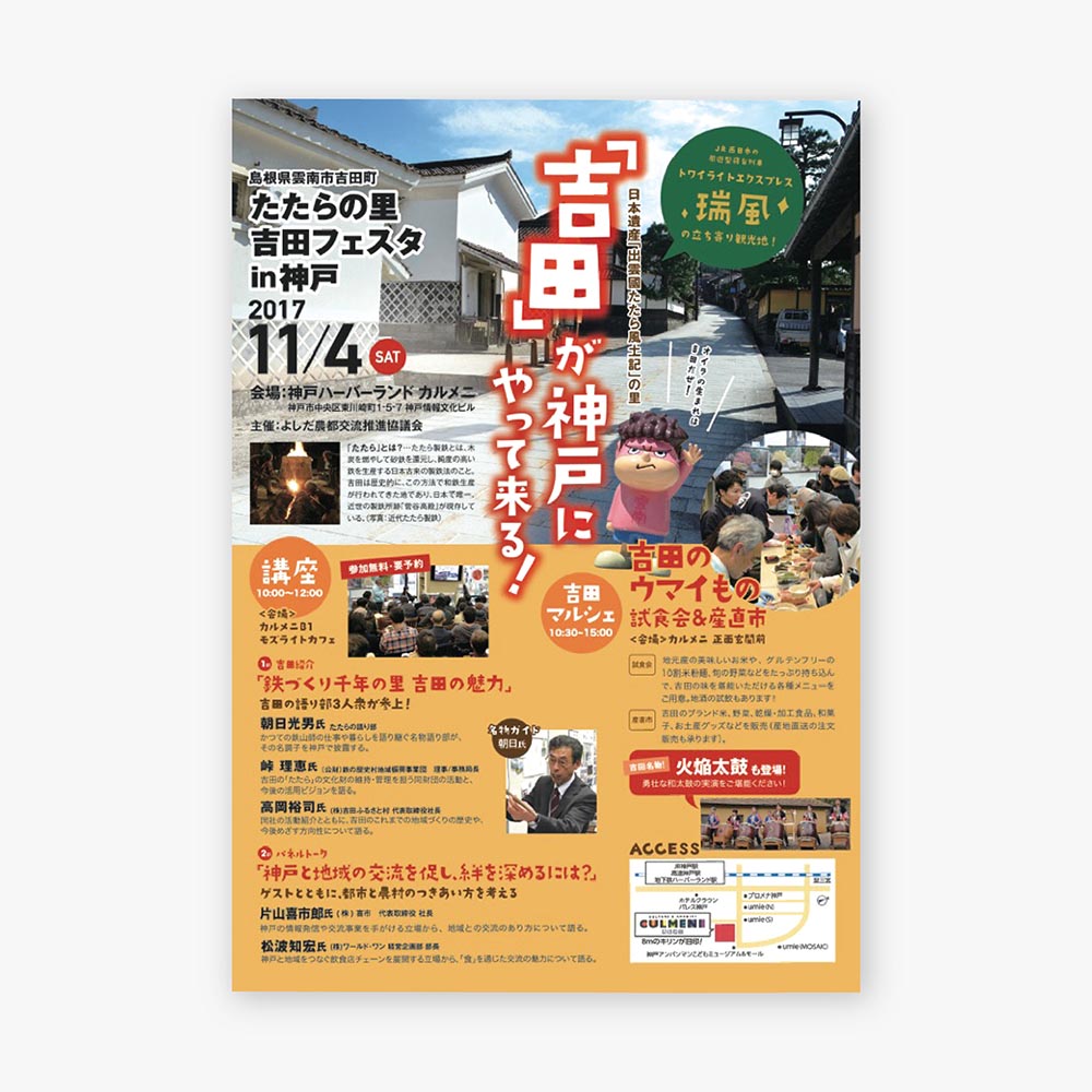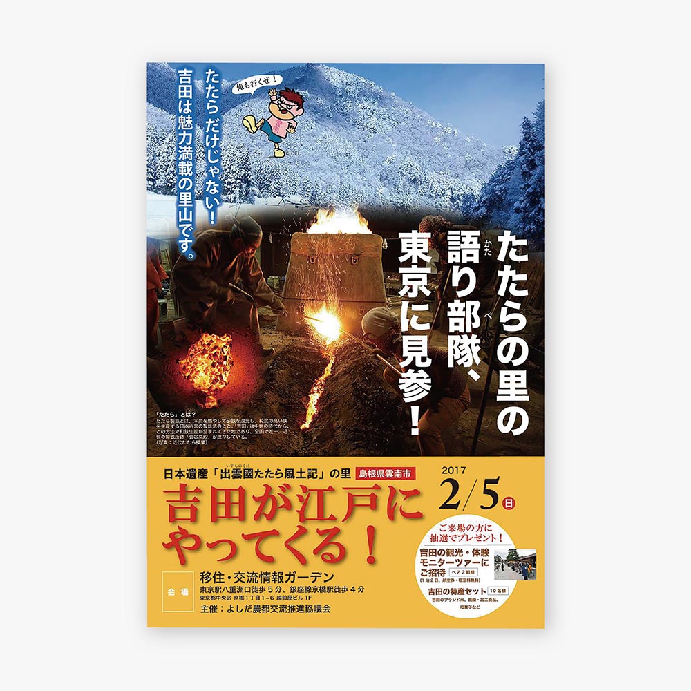 日本遺産に認定された「出雲圀たたら風土記」。その里にある島根県雲南市吉田町の豊かな食・農資源、文化資源、農都交流の取り組みを首都圏の人たちに紹介するイベント。会場との打合せや、プレスリリース作成、ポスター掲示依頼など、首都圏でのプロモーション活動と、イベント当日の運営をサポートしました。